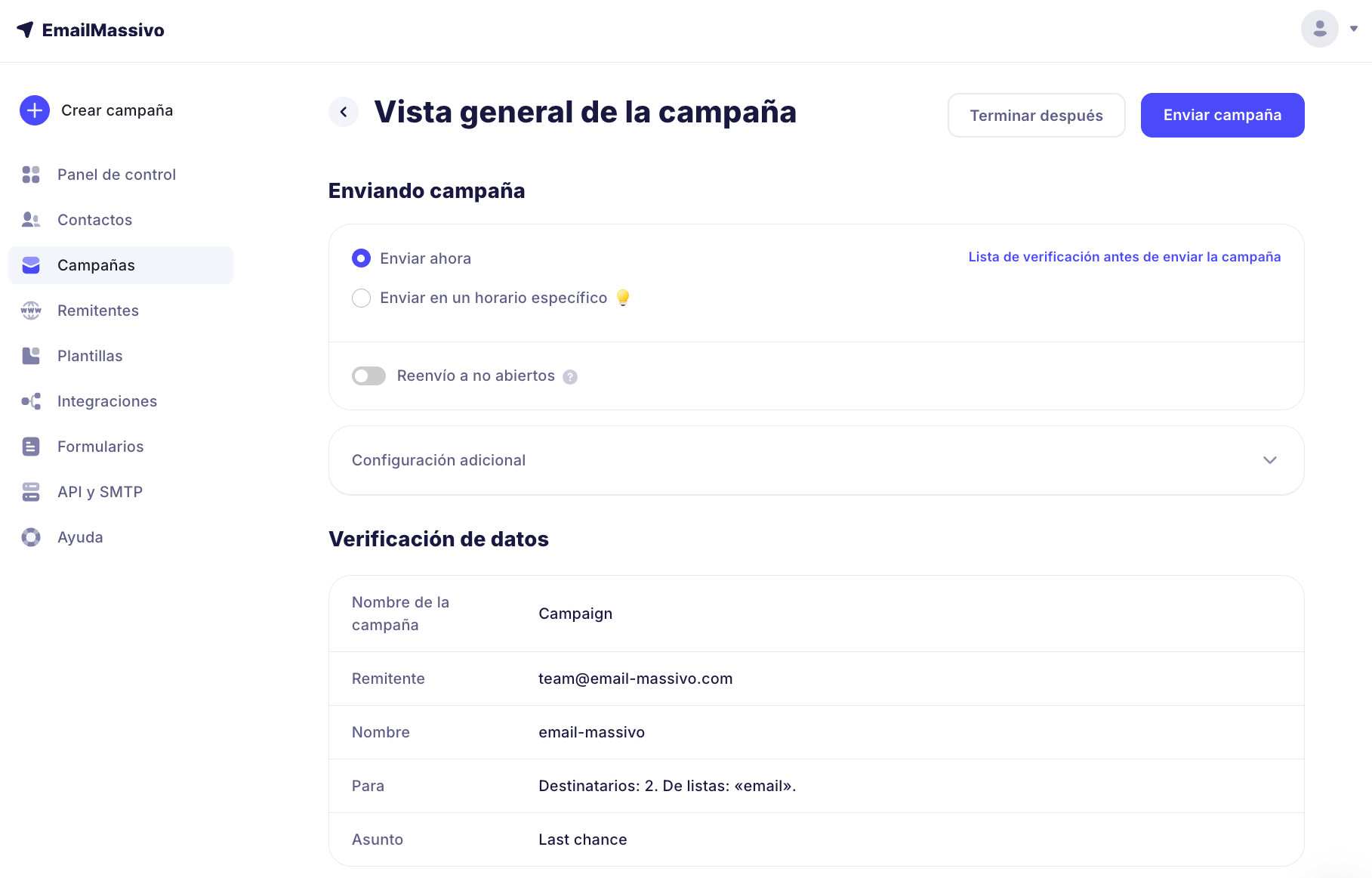 Esto concluye la guía de "Inicio rápido". En nombre de todo el equipo de EmailMassivo, te agradecemos por tu atención a nuestro servicio y te deseamos una experiencia de usuario agradable.