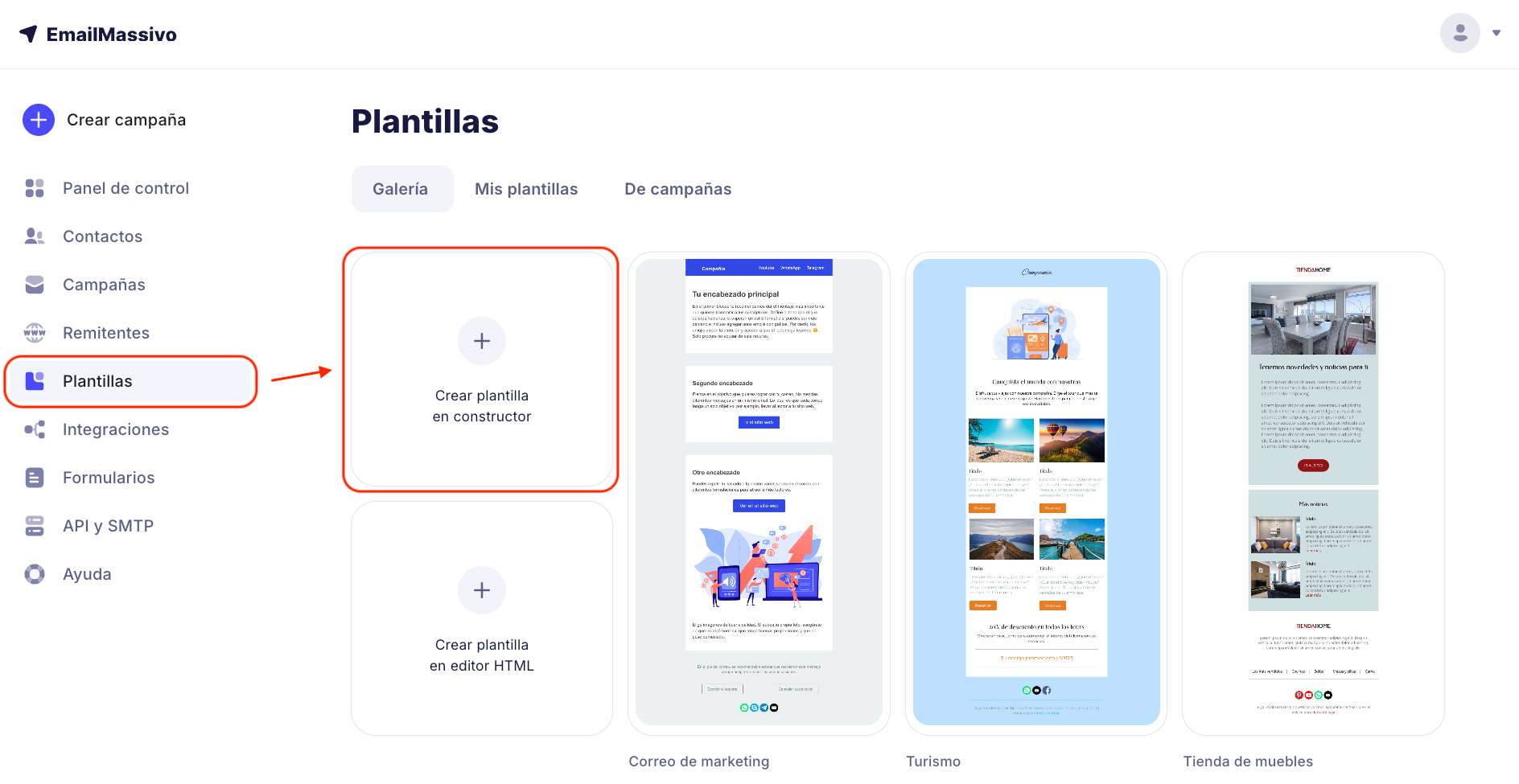 Para crear una plantilla de correo electrónico, por favor ve a la sección "Plantillas" y elige una de las tres formas sugeridas para crear una plantilla para tu futuro correo electrónico: