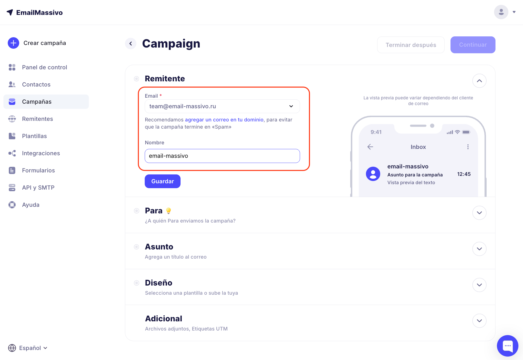 Ingresa el correo electrónico y el nombre del remitente. Necesitas agregar un remitente en tu propio dominio para que la campaña no termine en "Spam".
