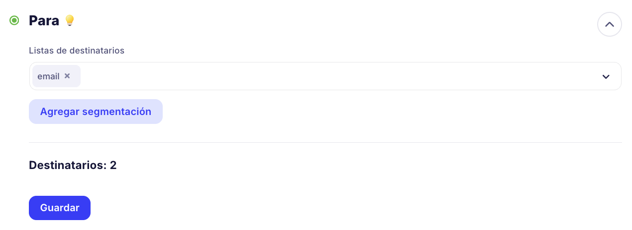 Después de seleccionar las listas a las que quieres enviar la campaña, verás el número total de destinatarios en estas listas. Luego haz clic en "Guardar".