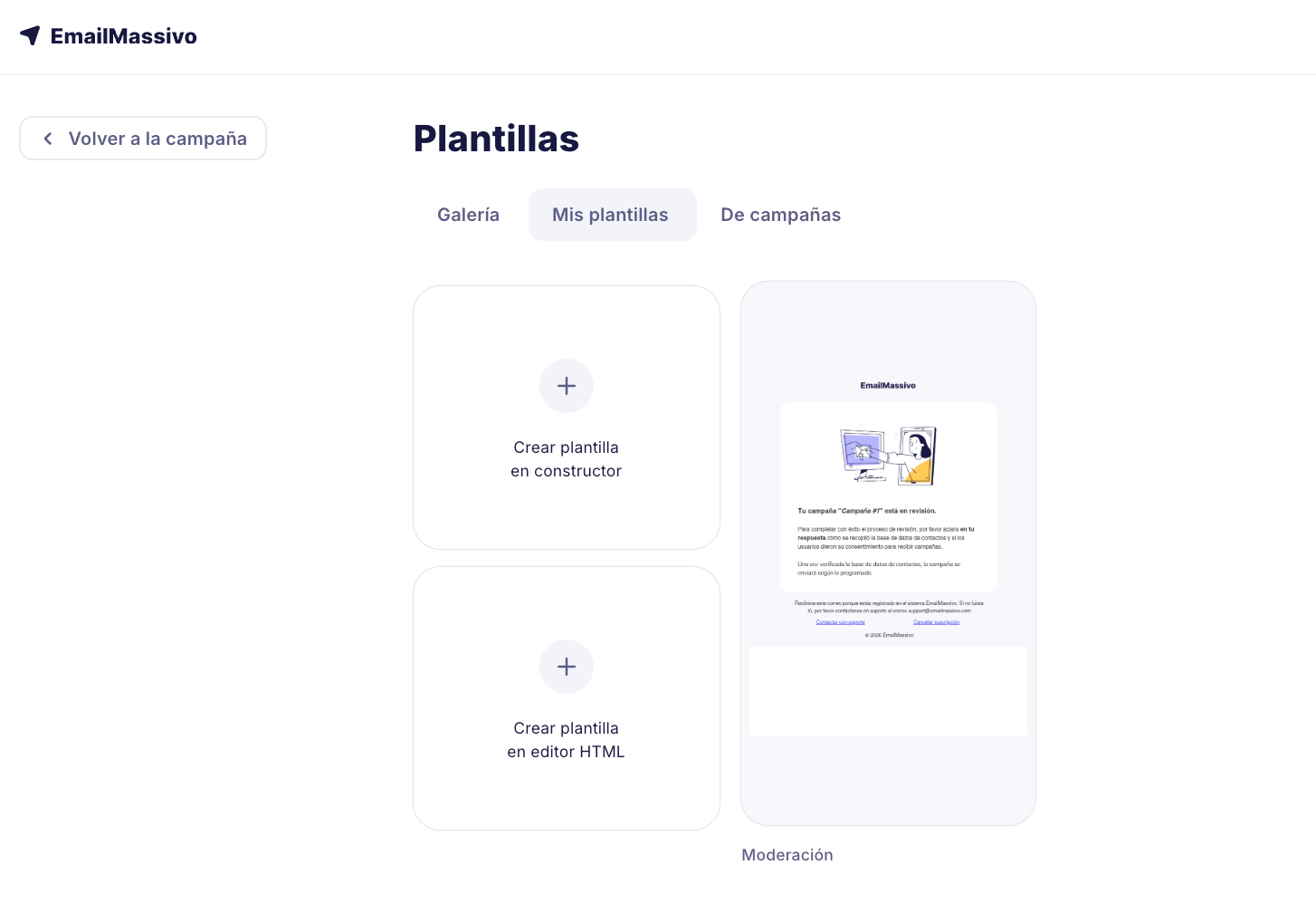 Como ya has creado una plantilla de correo electrónico para tu futura campaña, en este paso solo necesitas seleccionarla en la sección "Mis plantillas" y proceder a la siguiente etapa.