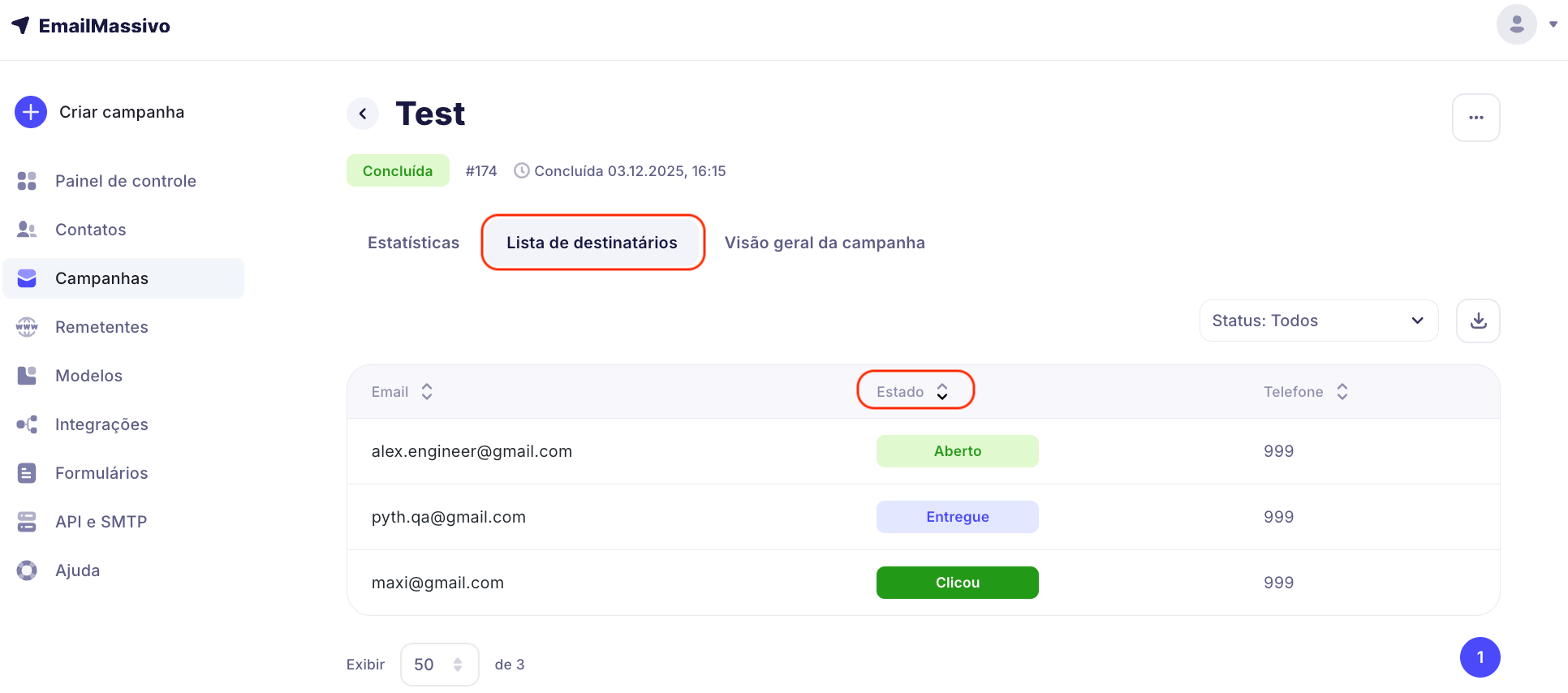 Você pode ver esses estados em campanhas em progresso e concluídas, na seção "Lista de destinatários", coluna "Estado".