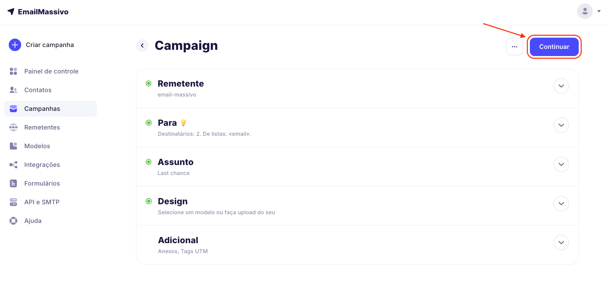 Preencha as informações da campanha. Depois que todos os itens estiverem preenchidos, clique em "Continuar".
