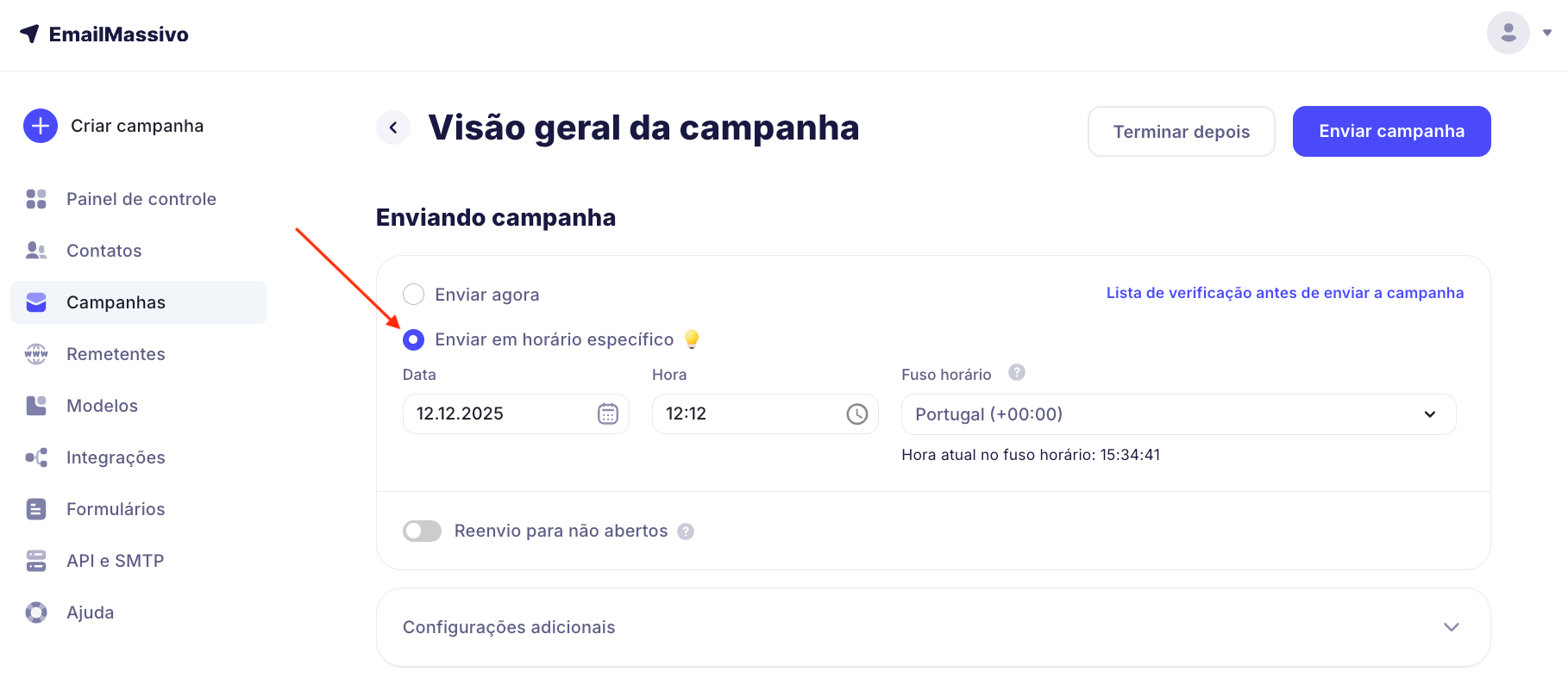 Já na etapa de criar a campanha principal, você pode planejar com antecedência um reenvio de emails para aqueles que não abriram o primeiro email. Isso ajudará a aumentar a eficácia da sua campanha. Leia como configurar o reenvio neste guia.