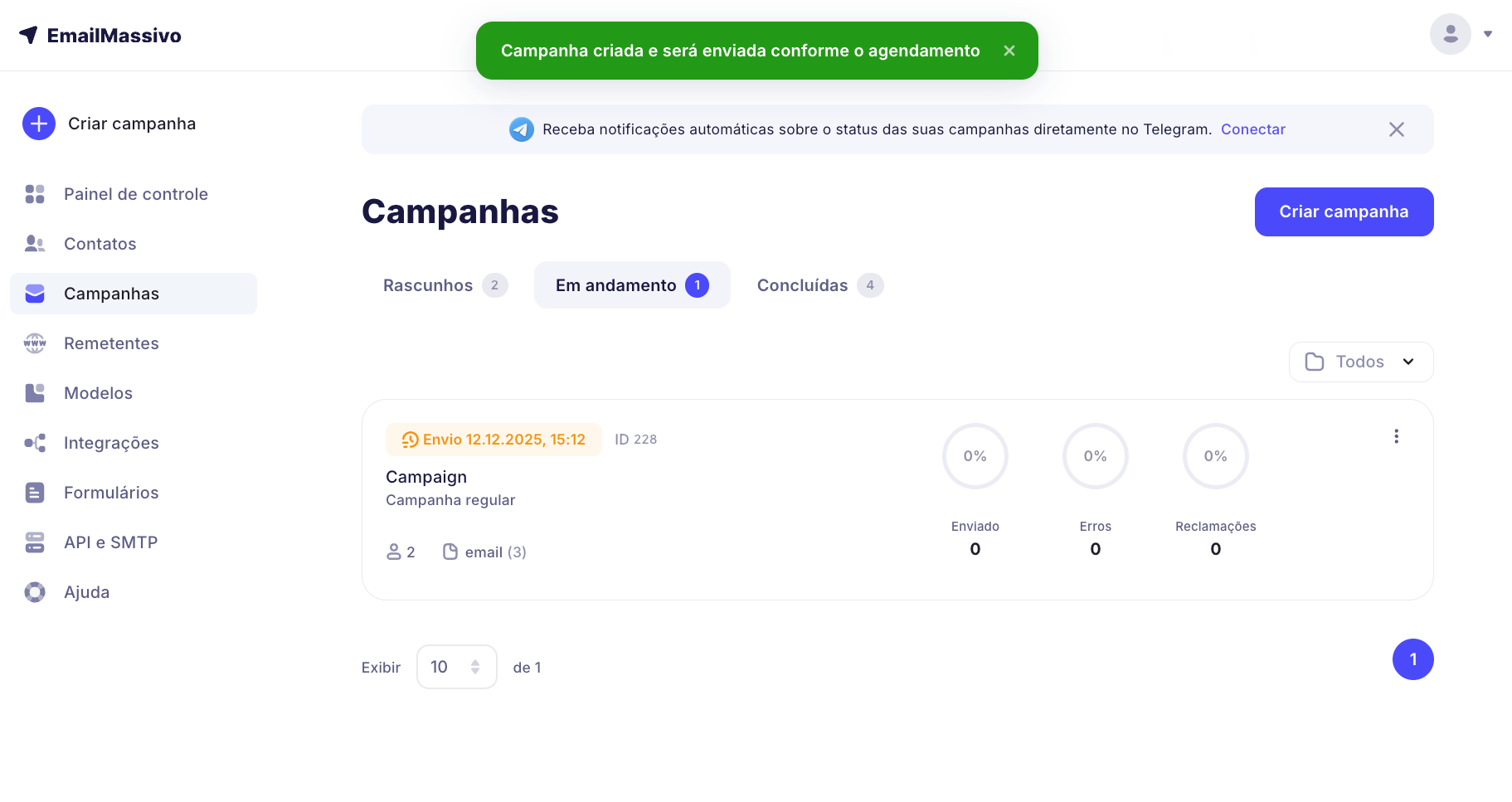 Pronto! A campanha foi criada e será enviada no horário e data que você especificou: