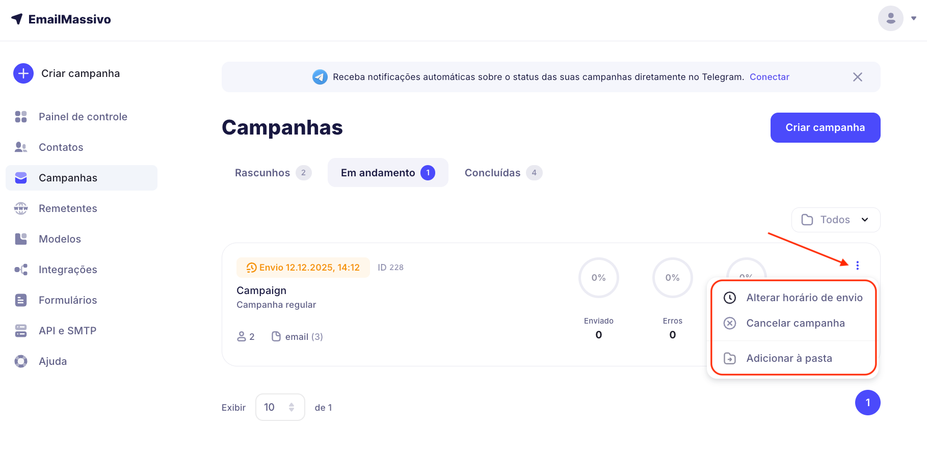 Uma campanha programada não pode ser modificada, mas você pode ajustar a hora de envio ou cancelar o envio. Se desejar fazer alterações, primeiro cancele o envio da campanha na seção "Campanhas" → "Em progresso".