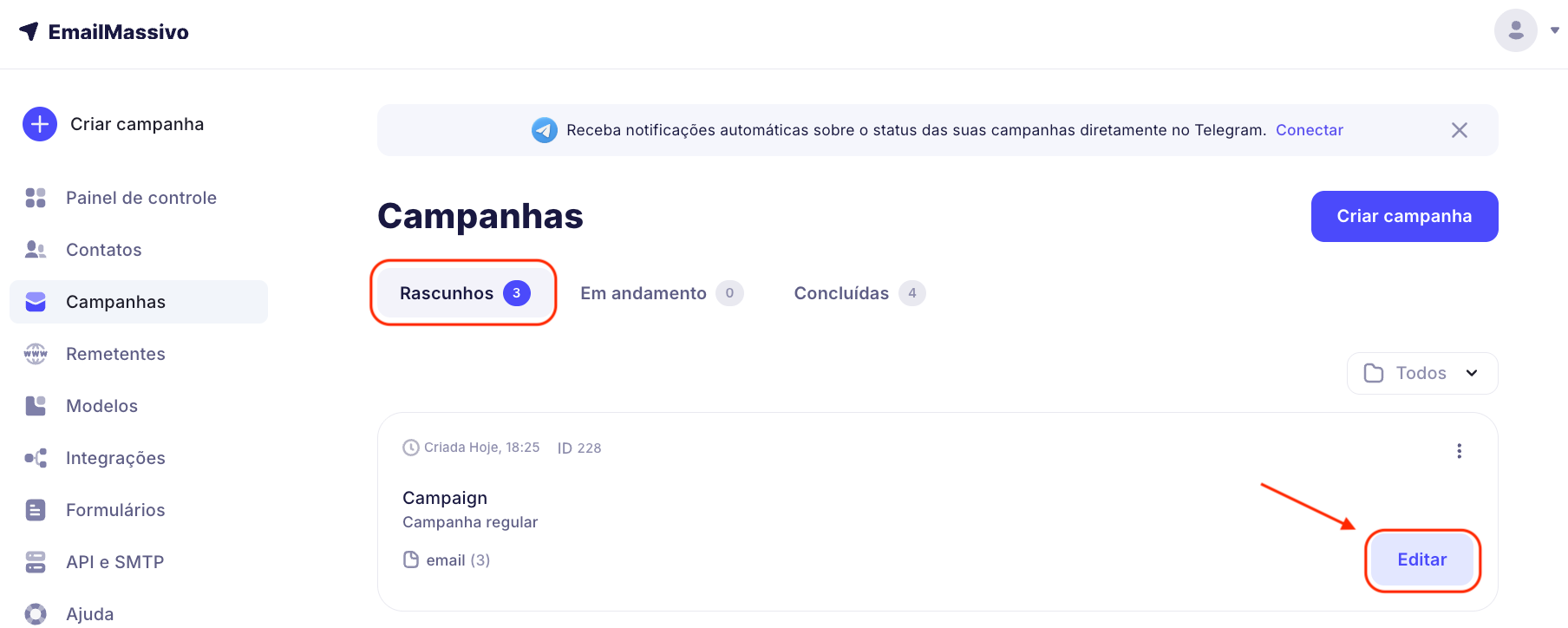 Em seguida, vá para "Rascunhos", faça as alterações necessárias e programe a campanha novamente.