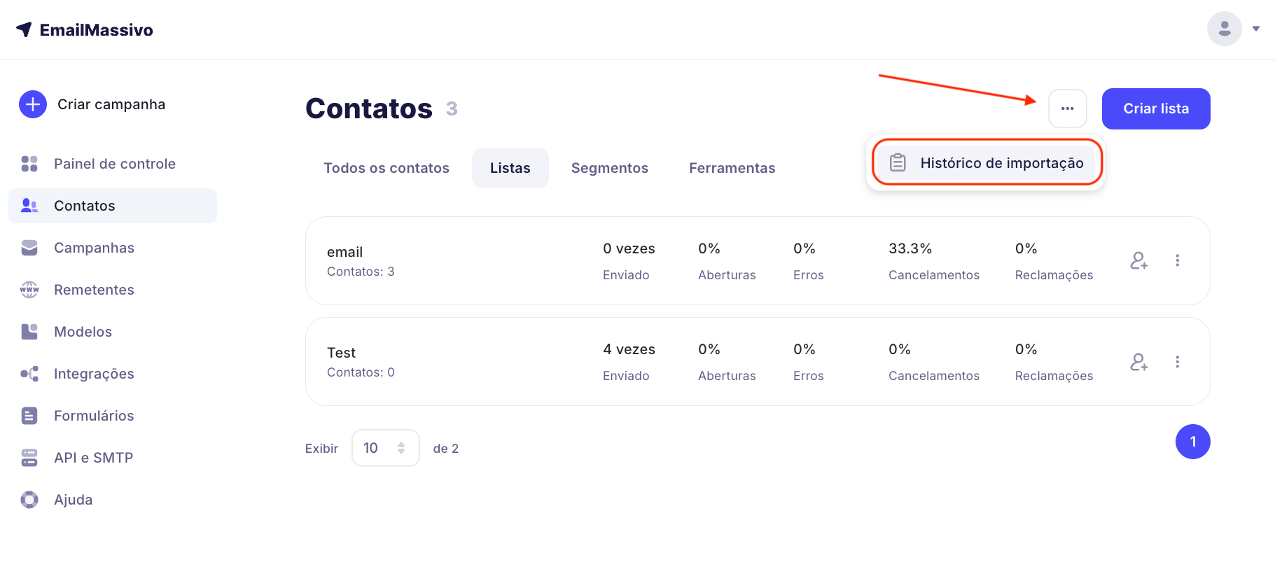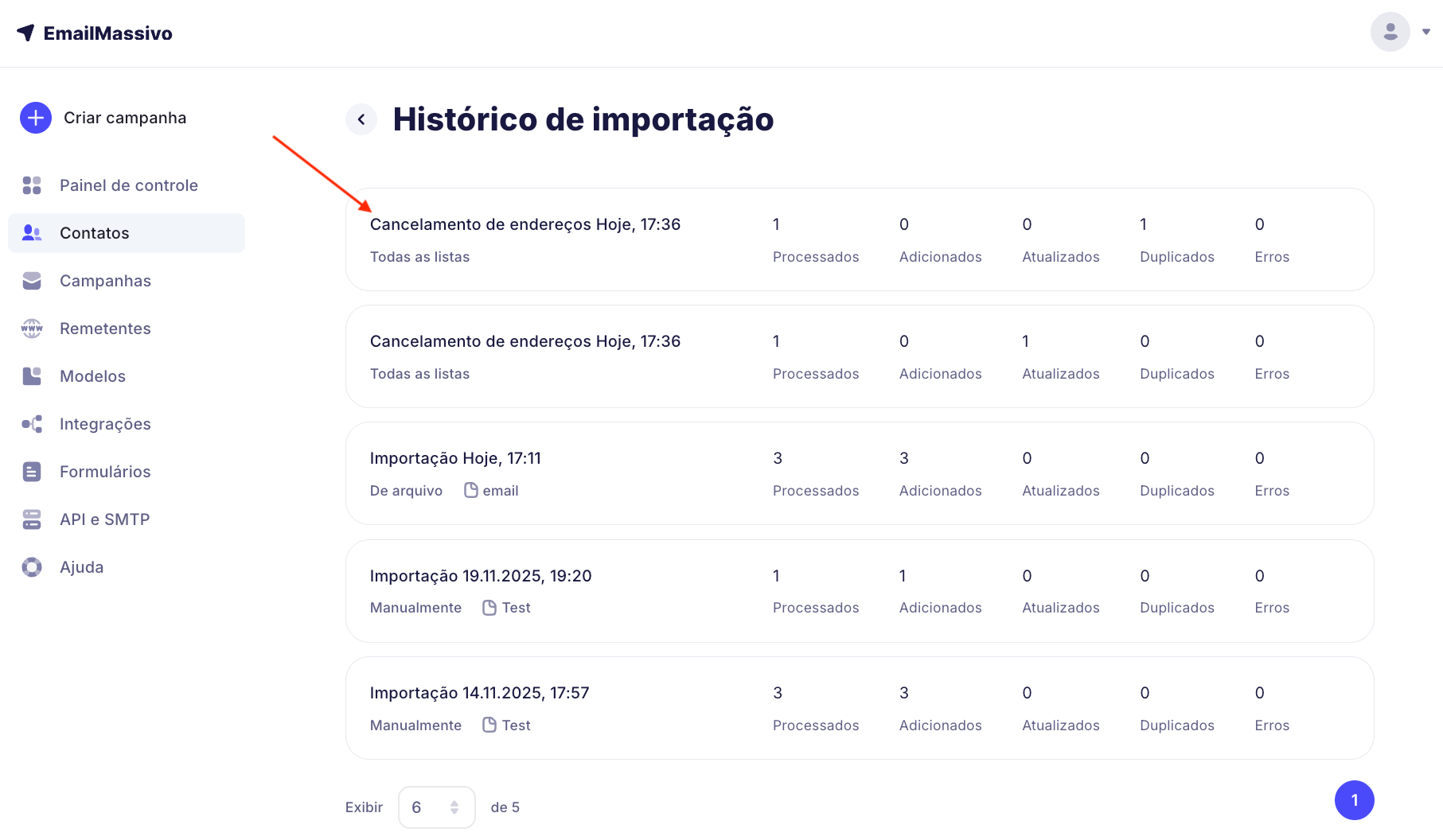 Você pode ver o histórico de importação de contatos descadastrados na seção correspondente: