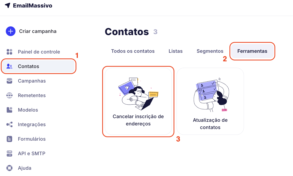 Se você tem sua própria base de dados de contatos descadastrados (de outra fonte, serviço ou seu próprio site) no EmailMassivo, você pode especificar independentemente os endereços que precisam ser descadastrados. Para fazer isso, abra a aba "Contatos" e vá para a seção "Ferramentas".