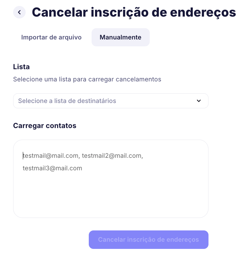 Quando você tiver adicionado contatos descadastrados e selecionado a lista, clique no botão "Descadastrar endereços":