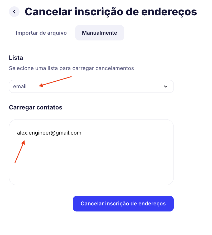 Ao carregar contatos descadastrados, selecione o método "Manual". Adicione contatos descadastrados ao campo "Carregar contatos", e também selecione a lista onde serão colocados. Escreva cada contato descadastrado em uma nova linha.