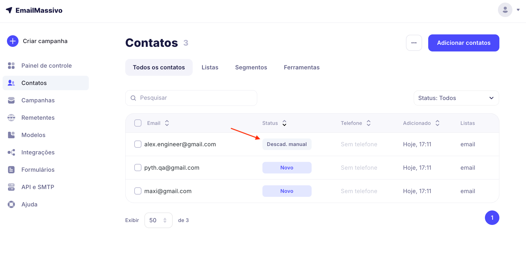 Pronto! Os contatos descadastrados foram adicionados à sua conta: