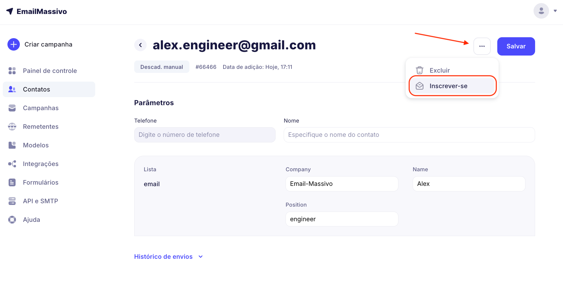 Se desejar, você pode voltar a cadastrar contatos descadastrados. Para fazer isso, selecione o contato que você quer cadastrar, clique nos três pontos → "Cadastrar":