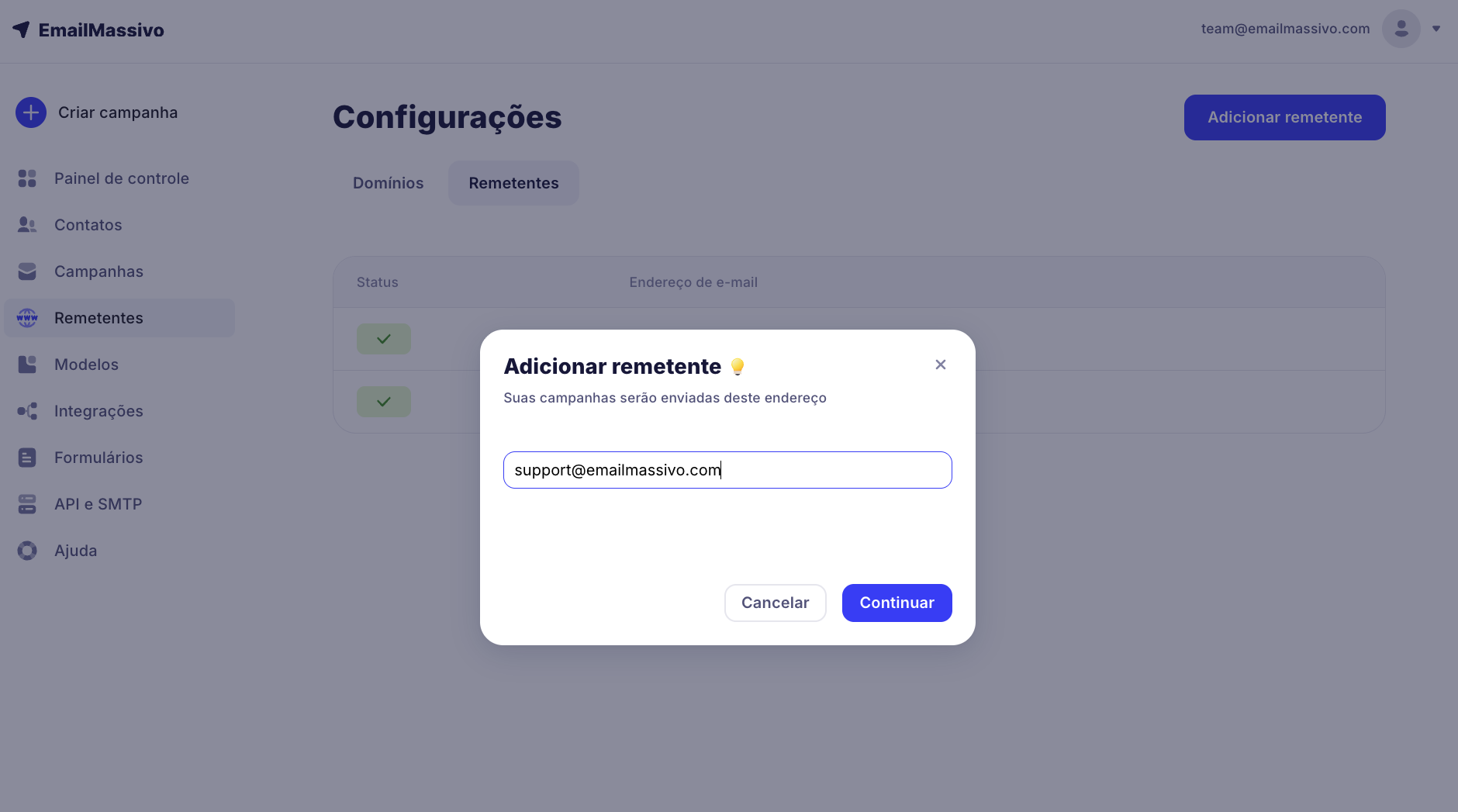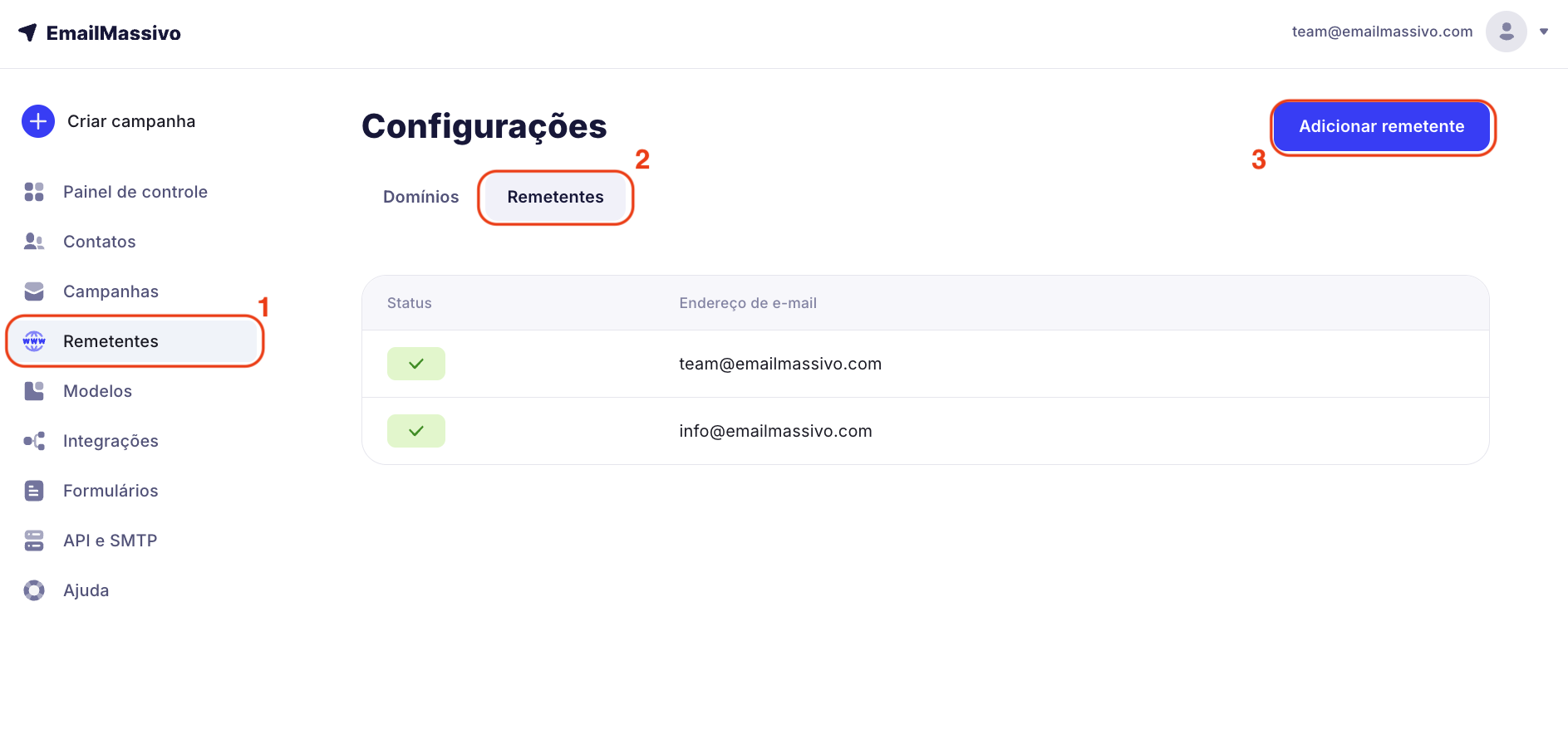 Para adicionar um novo remetente, primeiro você precisa adicionar e verificar seu domínio no EmailMassivo (leia mais sobre isso no guia), e depois criar um e-mail neste domínio.