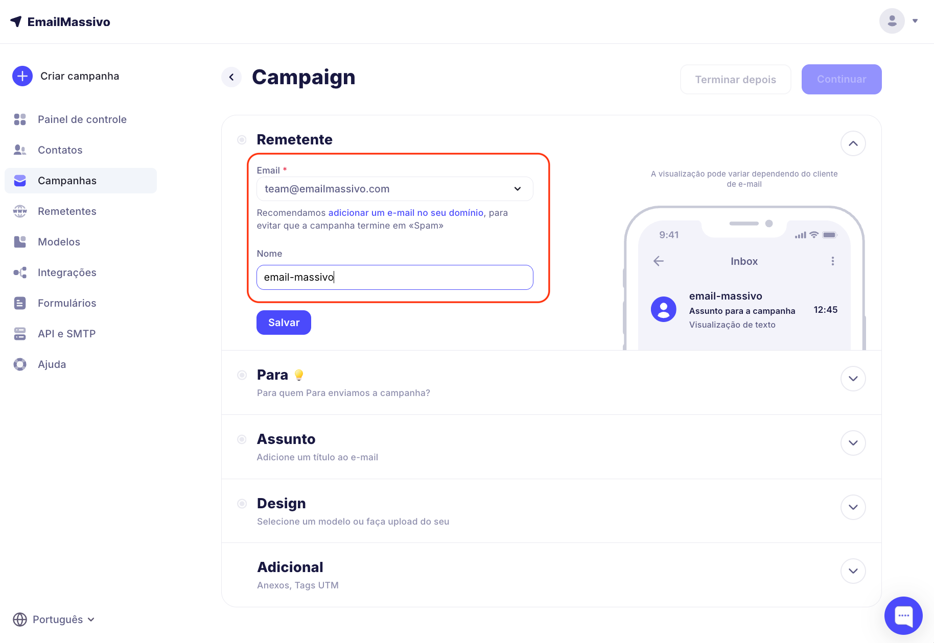 Agora, ao criar uma campanha, você poderá selecionar este e-mail como remetente.