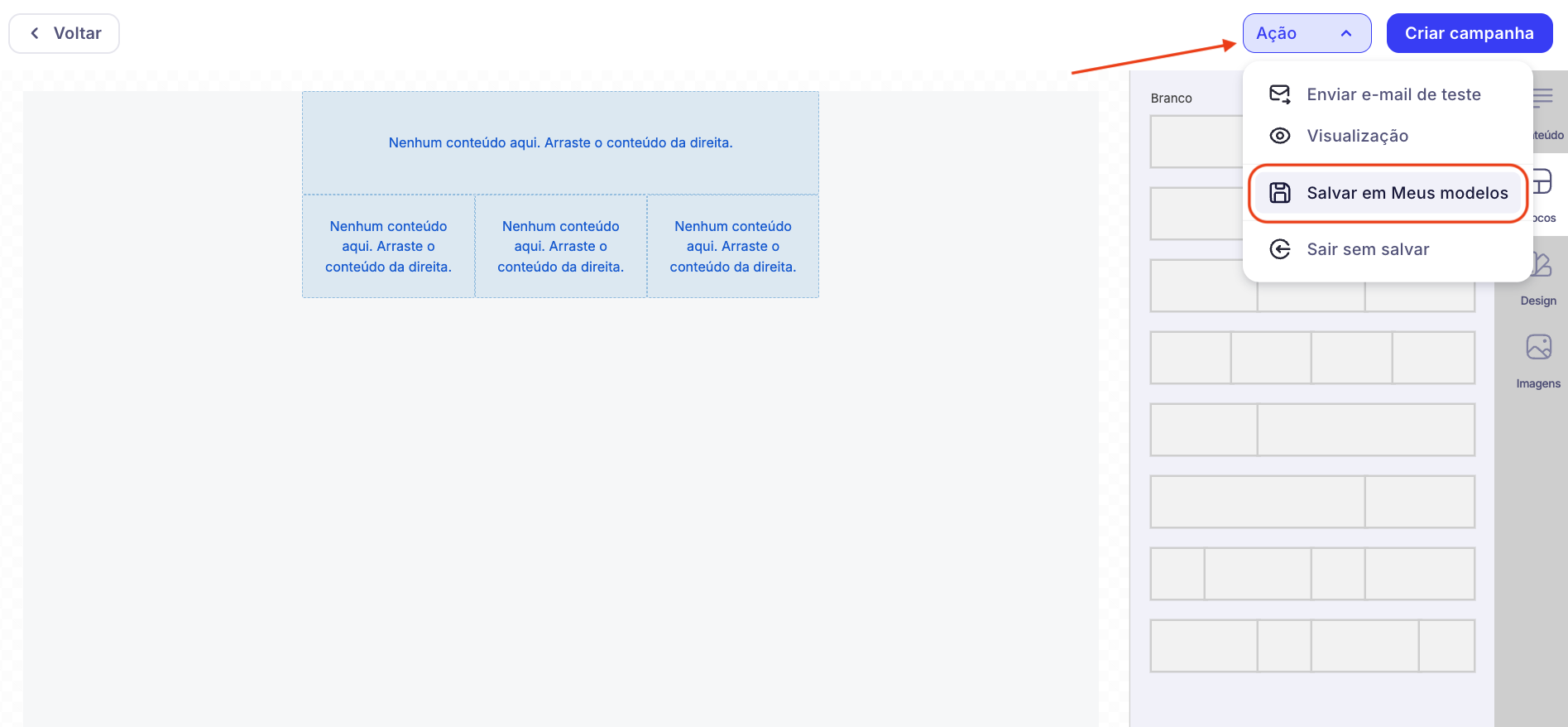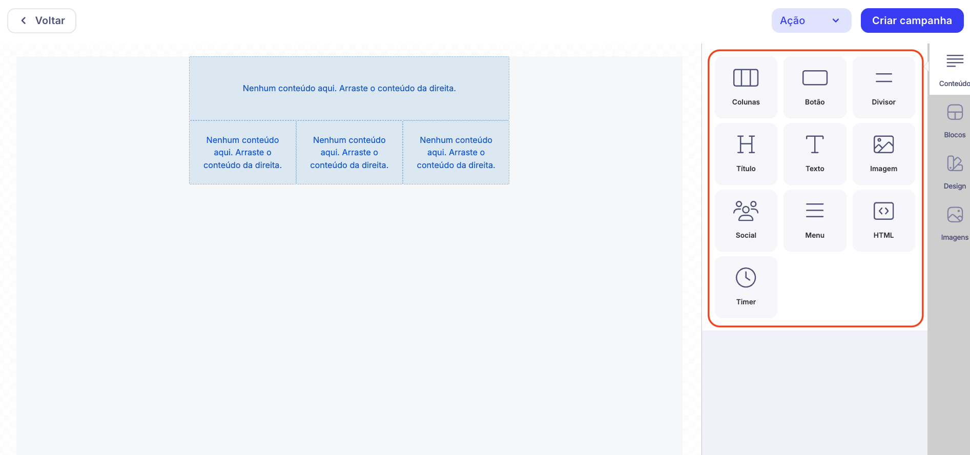 Na barra de ferramentas à direita na seção "Content", estarão disponíveis os elementos que você pode adicionar ao e-mail: