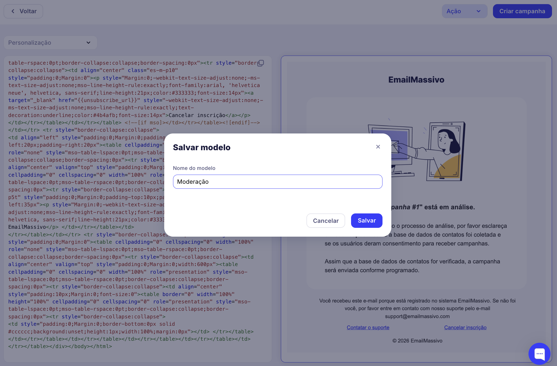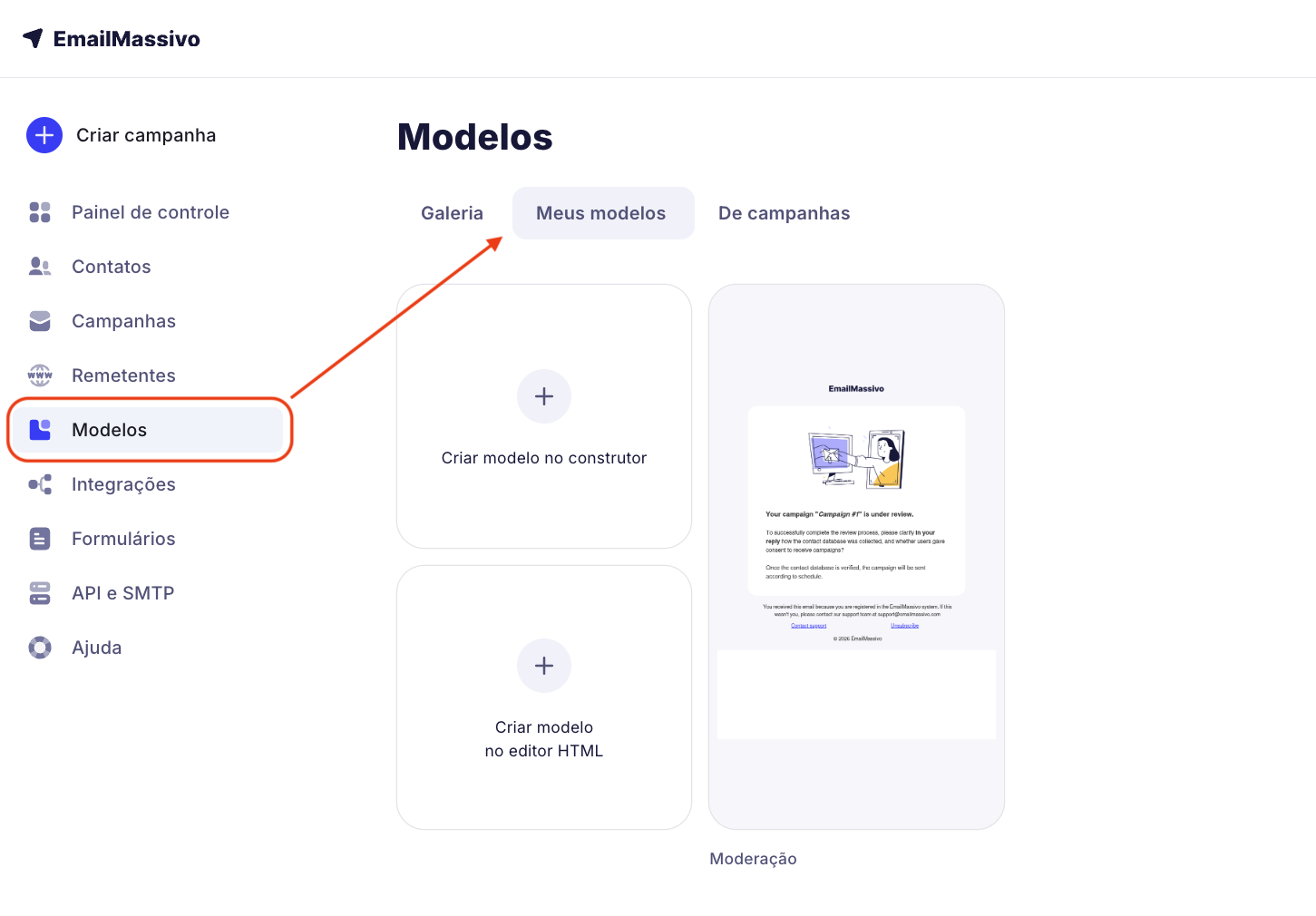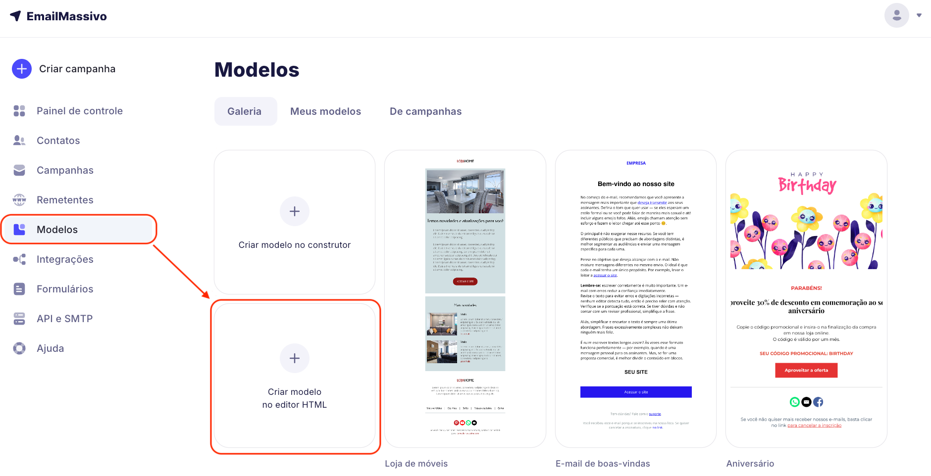 Para criar um template HTML no EmailMassivo, vá para a seção «Modelos» → «Criar template no editor HTML».