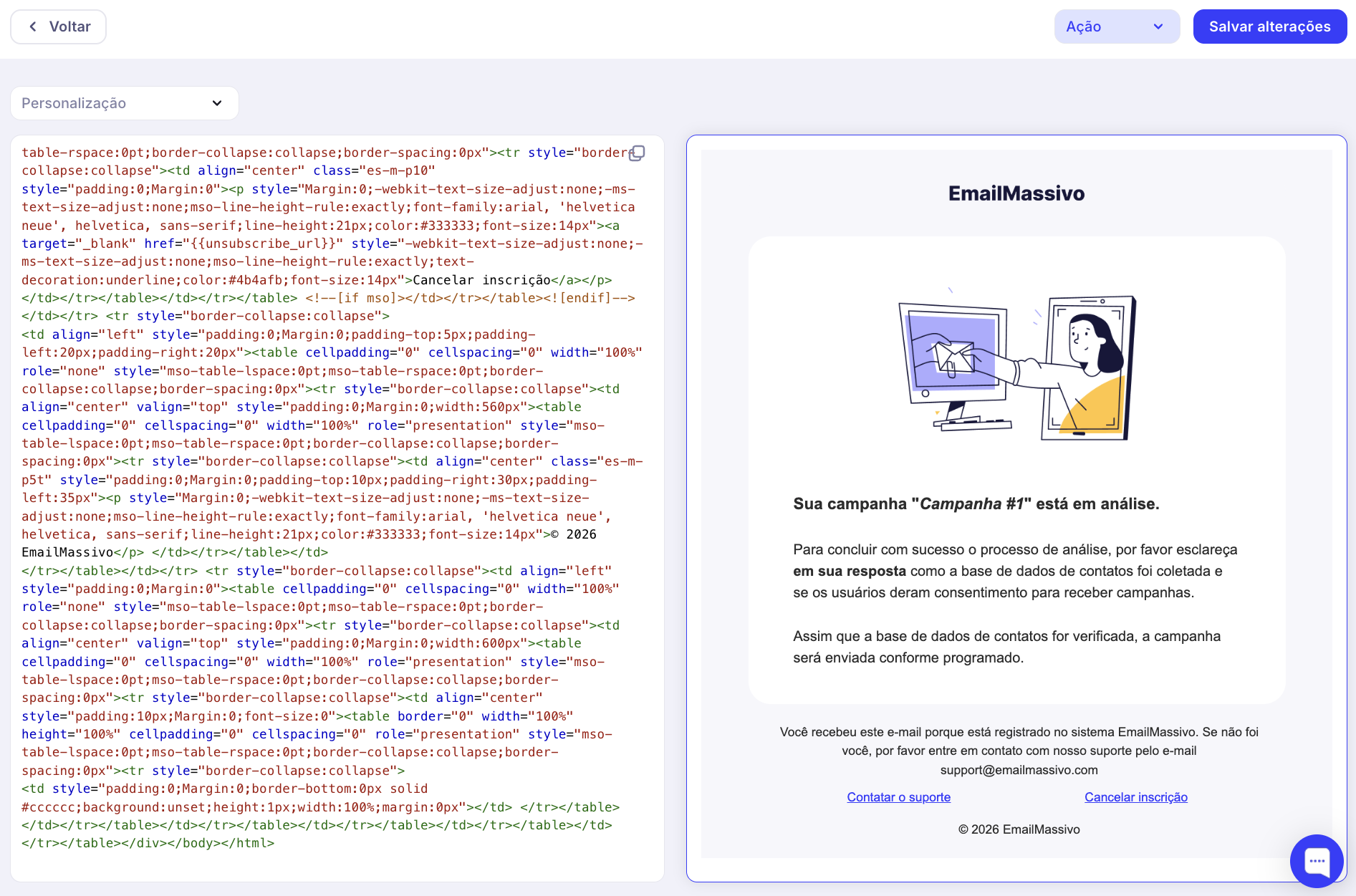 Além de criar um e-mail no construtor de e-mails integrado, o EmailMassivo permite carregar seu template HTML e usá-lo para envios de campanhas ou e-mails API.