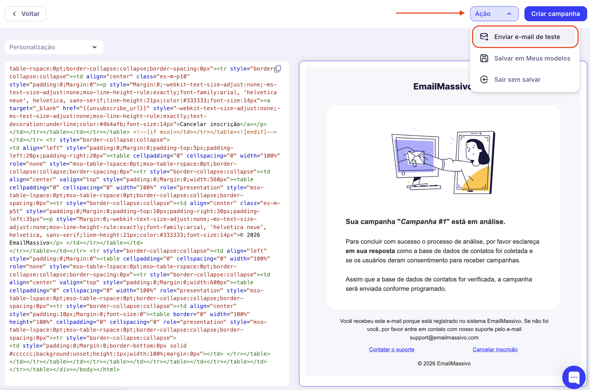 É especialmente importante testar os e-mails HTML. Você pode enviar um e-mail de teste para seu endereço de e-mail para ver como ele se parece. Para fazer isso, clique no botão «Ações» → «Enviar email de teste».