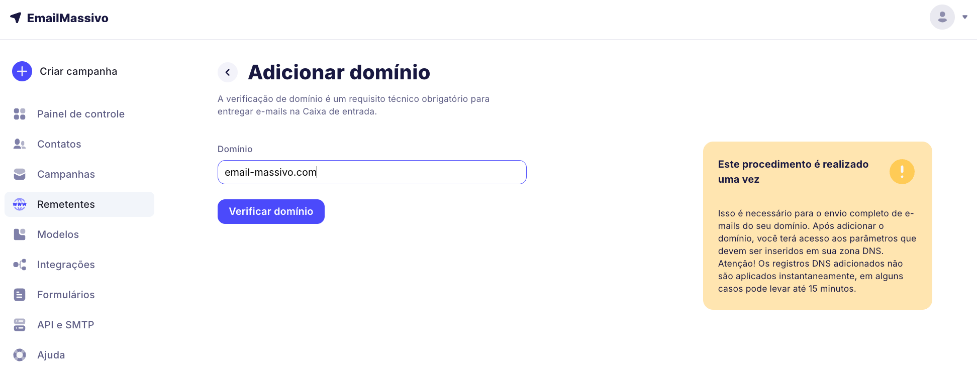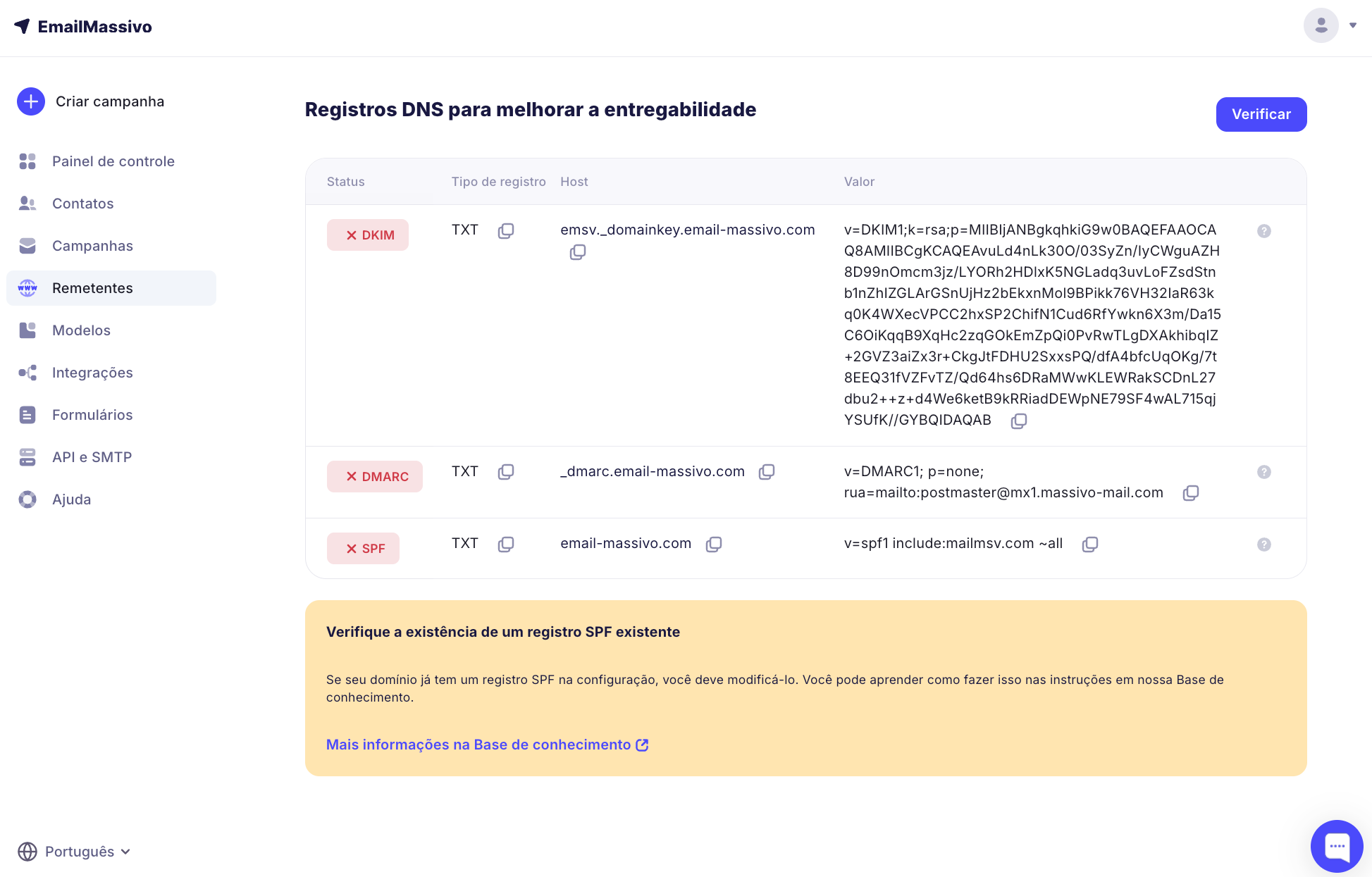 Depois de adicionar o domínio, clique no botão "Verificar domínio". No painel de controle do EmailMassivo, você terá acesso aos registros que precisam ser adicionados às configurações de registros DNS do seu domínio: