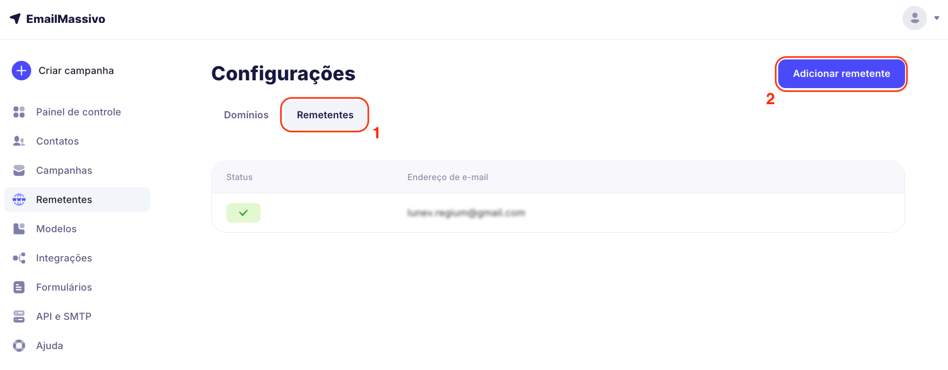 Para adicionar um novo remetente, vá para "Remetentes" e clique em "Adicionar remetente".