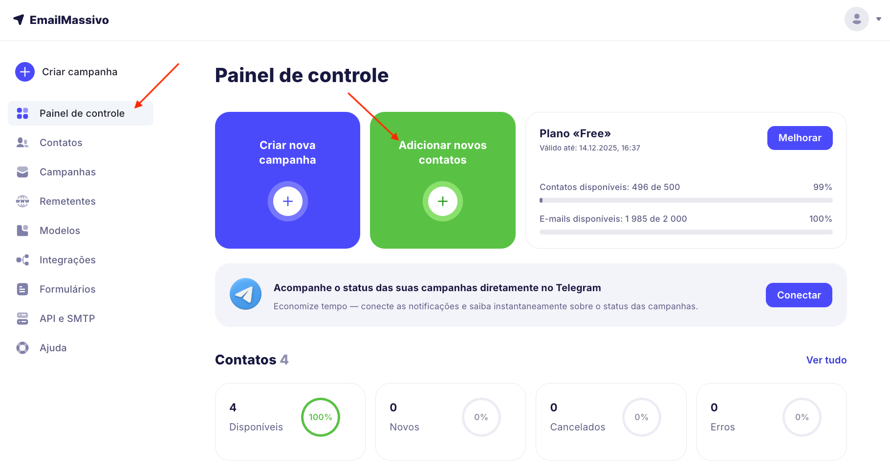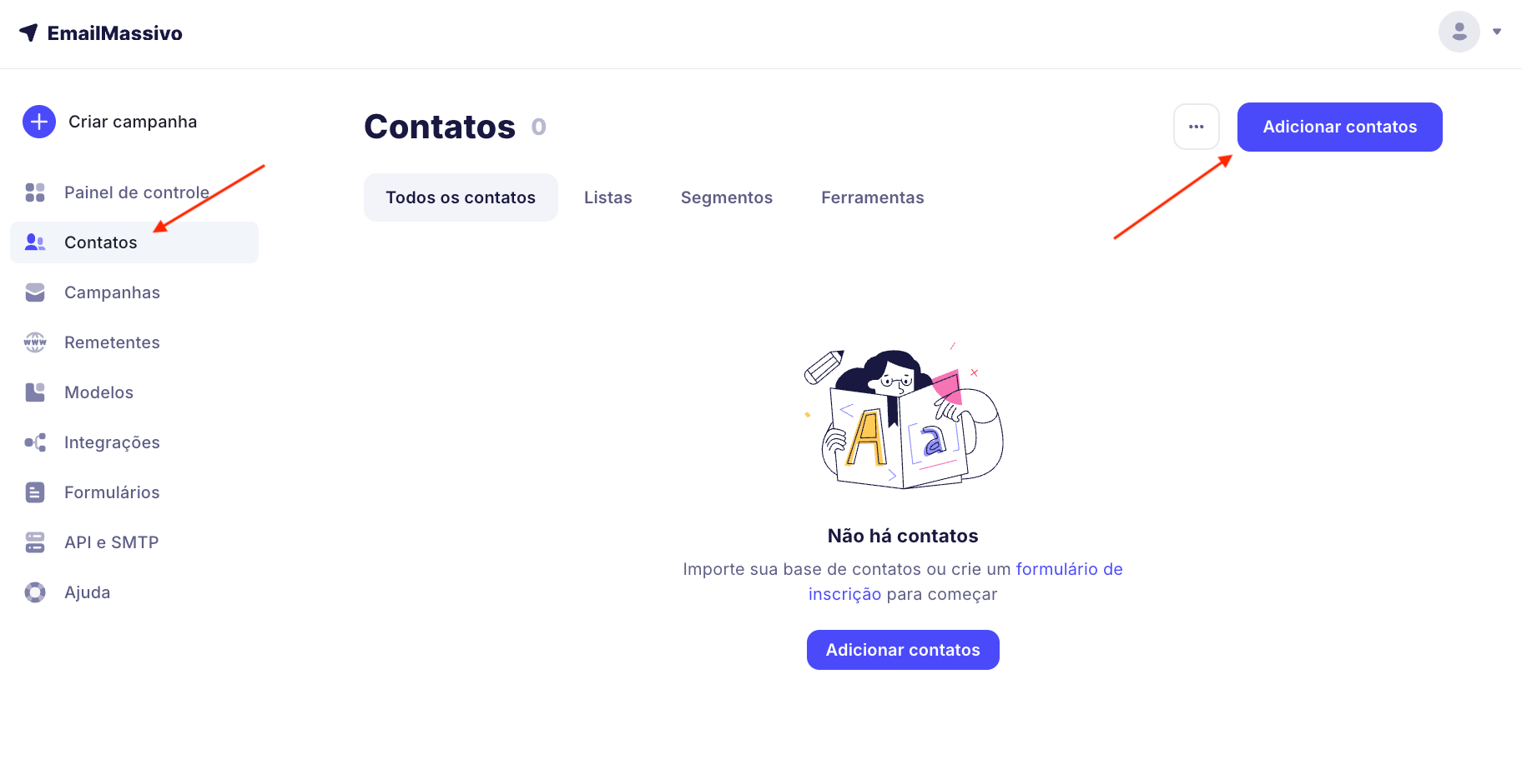 Na página principal, clique no botão "Adicionar contatos" ou vá para a aba "Contatos" e clique em "Adicionar contatos".
