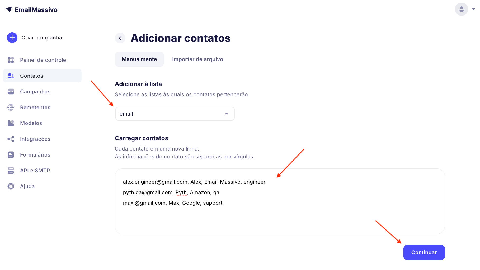 Você pode carregar contatos na seção "Contatos" de qualquer maneira conveniente, incluindo importar contatos de um arquivo externo – isso é especialmente conveniente se você usou anteriormente outro serviço para campanhas de e-mail e agora quer transferir sua base de dados de contatos para o EmailMassivo.