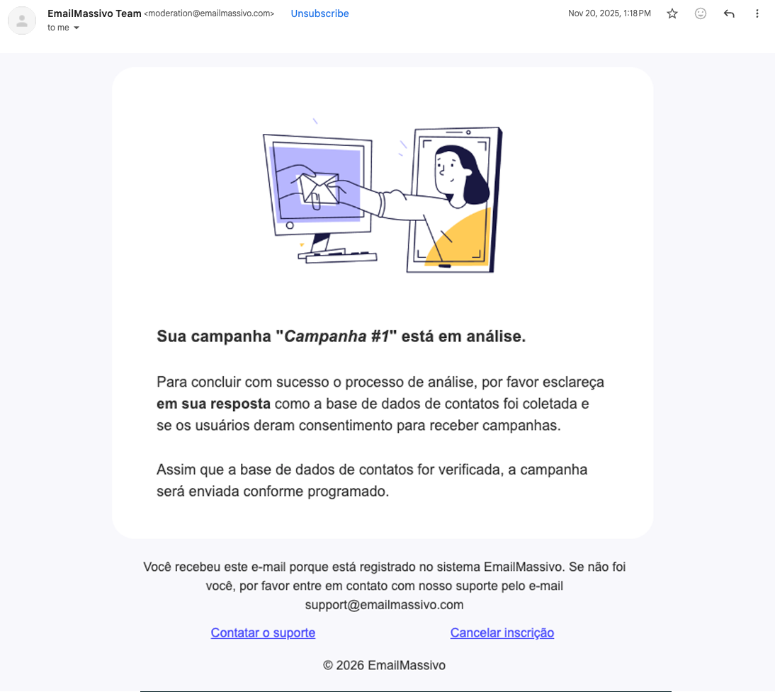A moderação é uma verificação da base de dados do cliente, do e-mail do remetente e do conteúdo do e-mail contra uma série de critérios. Antes de enviar para uma nova base de dados, a campanha passa por moderação obrigatória. As etapas de verificação estão interconectadas, algumas delas não são apenas um requisito do nosso serviço, mas também regras para todos os serviços de e-mail.