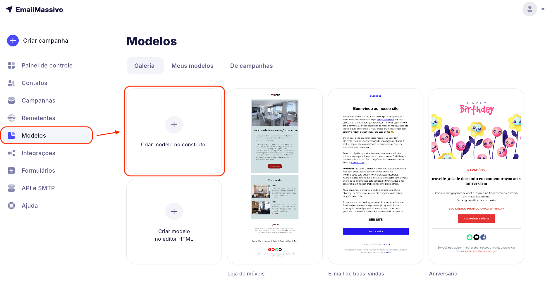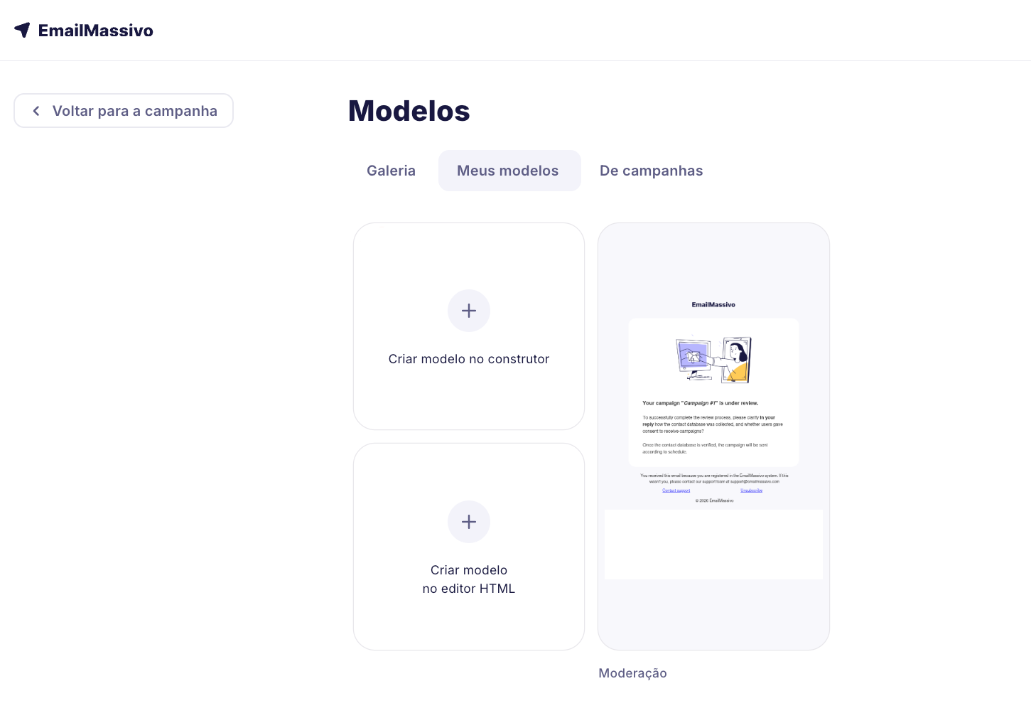 Para criar um template de e-mail, por favor vá para a seção "Modelos" e escolha uma das três formas sugeridas para criar um template para seu futuro e-mail: