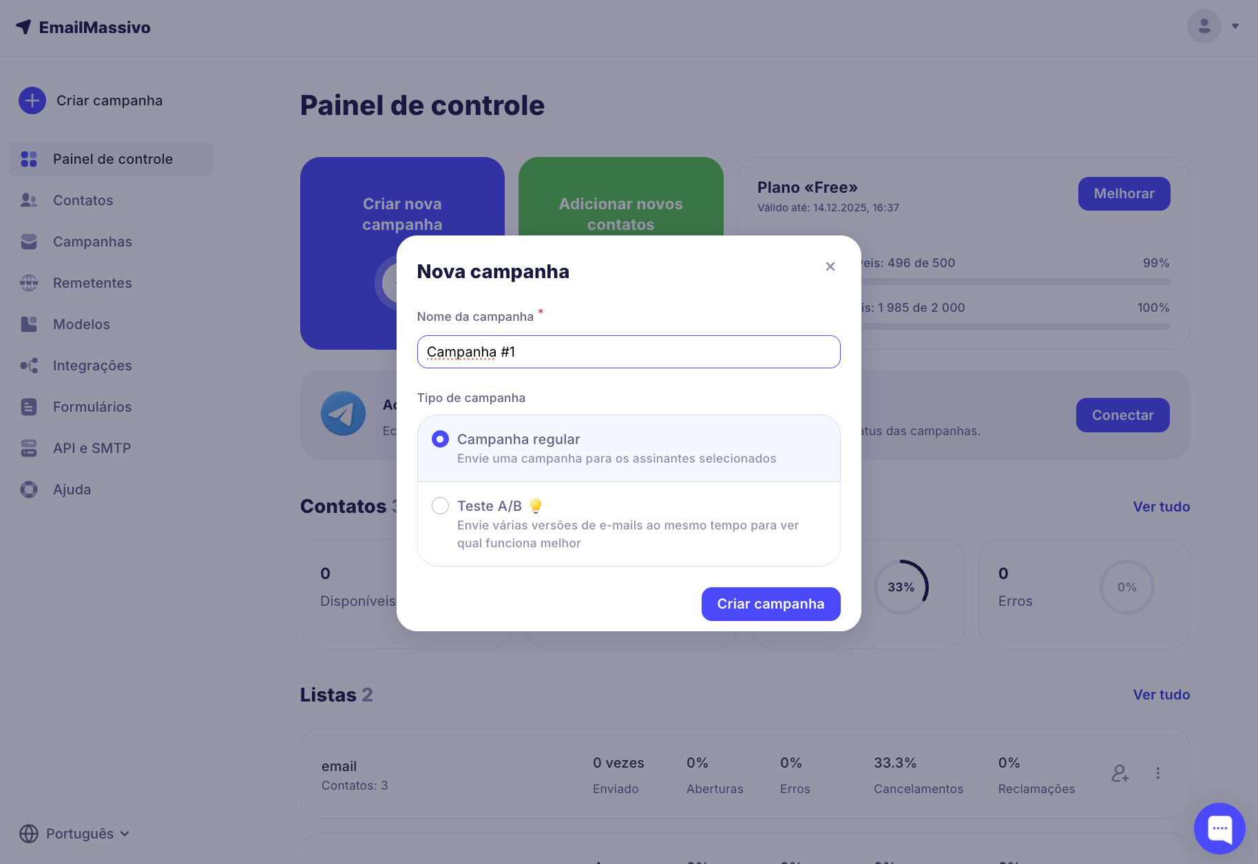 Digite o nome da campanha, selecione o tipo "Campanha regular" e clique em "Criar campanha".