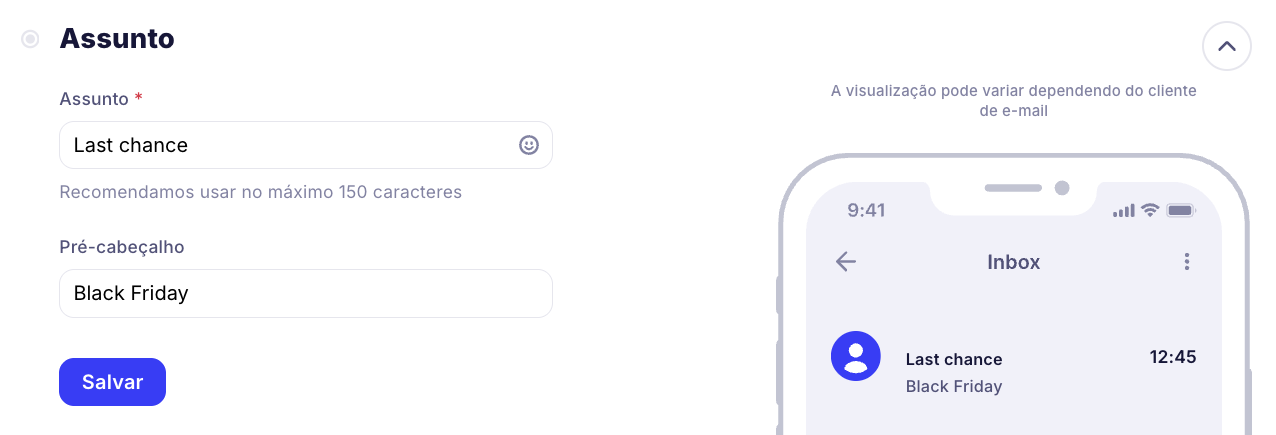 O assunto do e-mail é a parte da mensagem que o assinante vê quando vai para a pasta "Caixa de entrada". Os assinantes julgam se abrir o e-mail com base no assunto, então ele deve ser atraente, informativo e breve.